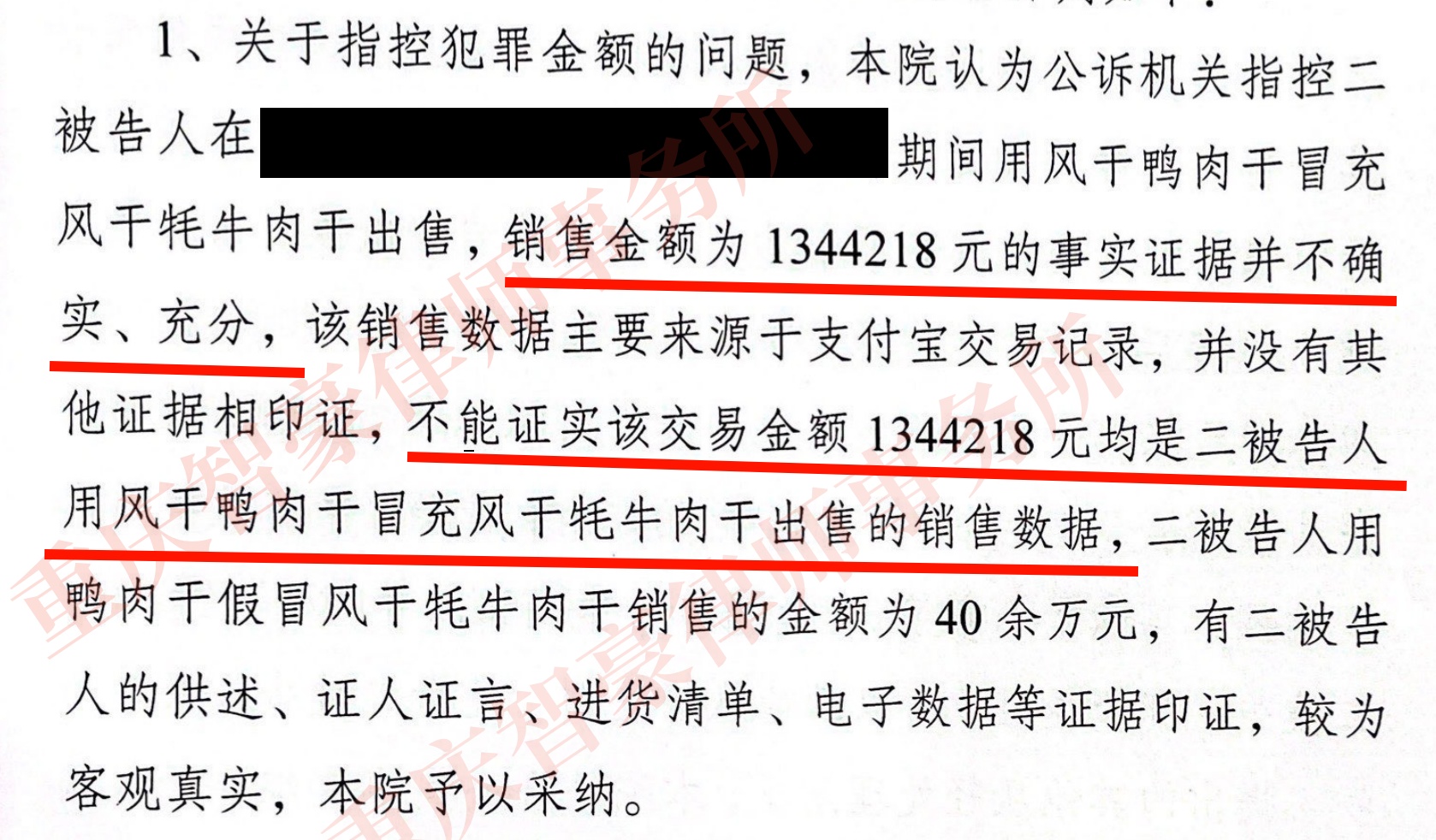 案情简介:当事人用鸭肉冒充牛肉干,被刑事立案,初始涉案金额134万元,面临十年以上重刑。律师介入后成功争取,金额骤降至40余万元,最终获缓刑。
