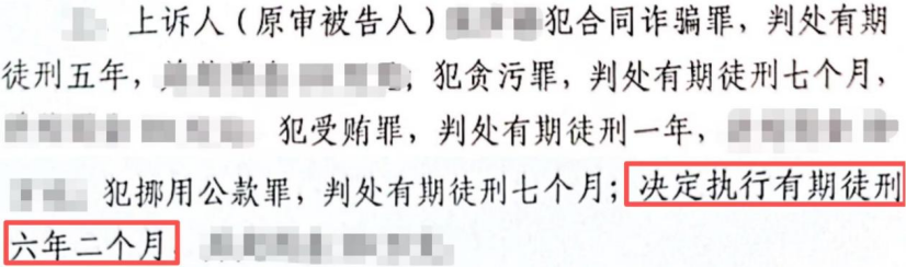 当看到量刑结果的那一刻,家属觉得天都塌了:“贪污罪,判了七个月;受贿罪,判了一年;挪用公款罪,判了七个月。而最致命的诈骗罪,判了十一年!数罪并罚,决定执行有期徒刑十二年六个月。”