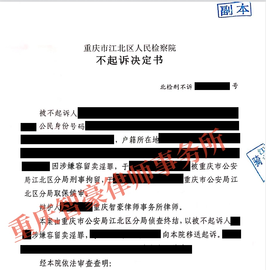 案情简介:杨范因涉嫌容留卖淫被刑事拘留,重庆智豪律师事务所介入辩护,仅用37天成功取保候审,并通过多轮沟通和法律论证,最终促成检察机关作出不起诉决定。