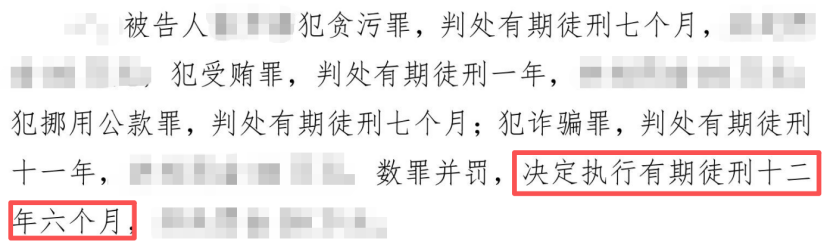 当看到量刑结果的那一刻,家属觉得天都塌了:“贪污罪,判了七个月;受贿罪,判了一年;挪用公款罪,判了七个月。而最致命的诈骗罪,判了十一年!数罪并罚,决定执行有期徒刑十二年六个月。”
